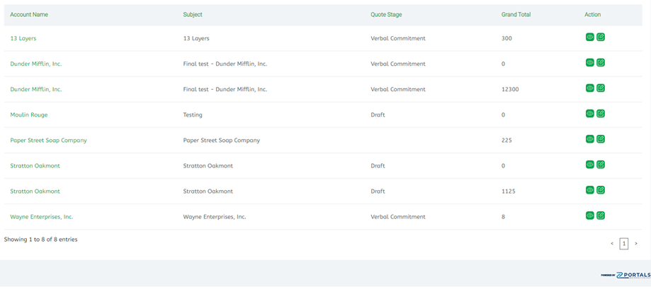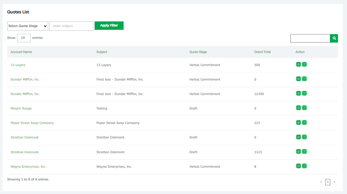 In the main quotes page you will find all quotes that have drafted, sent, won and lost. The main list will show you each quote, the stage and expected earnings. You can filter at the top of the list by stage